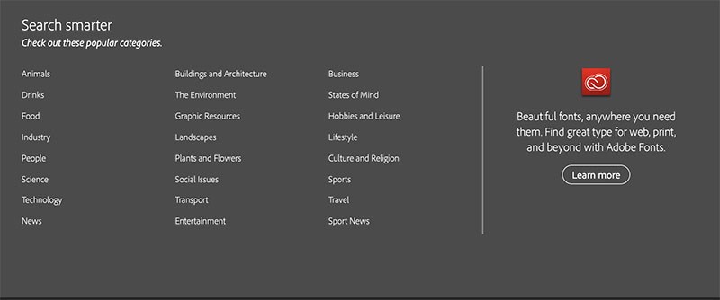 Cách sử dụng Adobe Stock khá đơn giản. Bạn chỉ cần nhấp vào thanh tìm kiếm hình ảnh theo từ khóa bất kỳ. Công cụ sẽ gợi ý các từ khóa liên quan ngay khi bạn đang gõ tìm kiếm. Ngoài ra, người dùng có thể tìm ảnh stock theo chủ đề như động vật, công trình và kiến trúc, kinh doanh, đồ uống,....