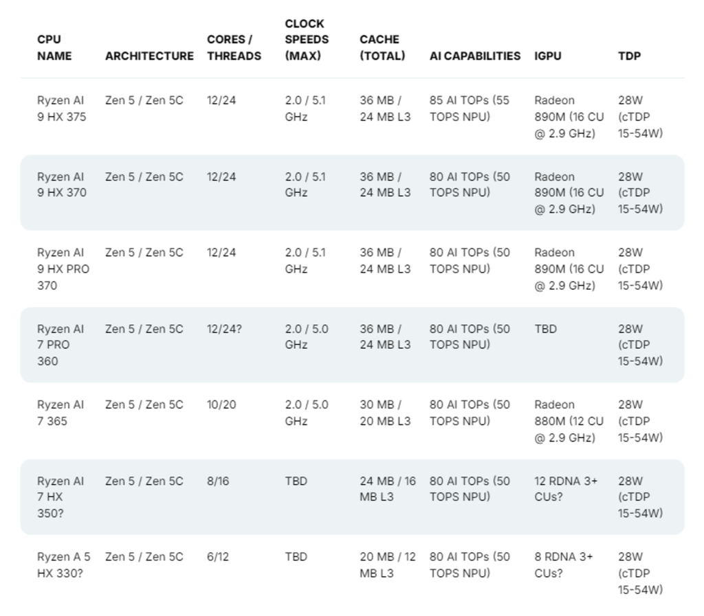 AMD Ryzen AI 9 HX 370 APU dựa trên nền tảng "Strix Point", có chip 12 lõi và 24 luồng có cấu hình 4 Zen 5 và 8 Zen 5C. Chip này chạy ở xung nhịp tăng tốc lên đến 5.1 GHz, cung cấp bộ nhớ đệm 36 MB (24 MB L3 + 12 MB L2) & Radeon 890M iGPU với 16 đơn vị tính toán hoặc 1024 lõi.