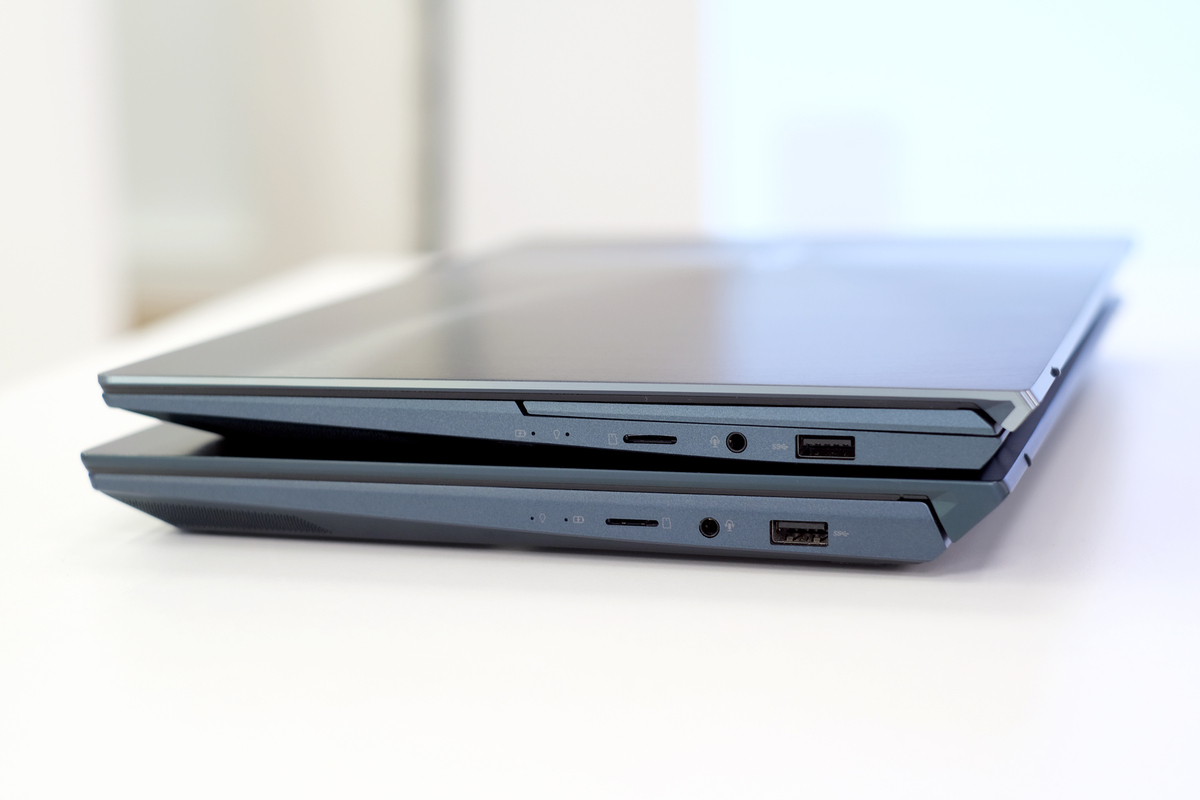 Về thiết kế, máy chỉ mỏng khoảng 1.7cm cùng cân nặng 1.6kg. Hai bên thành máy là các cổng kết nối. Bao gồm 2 USB-C hỗ trợ chuẩn Thunderbolt 4, USB tiêu chuẩn, giắc cắm tai nghe 3,5 mm, khe cắm thẻ microSD, hệ thống đèn báo pin, sạc.