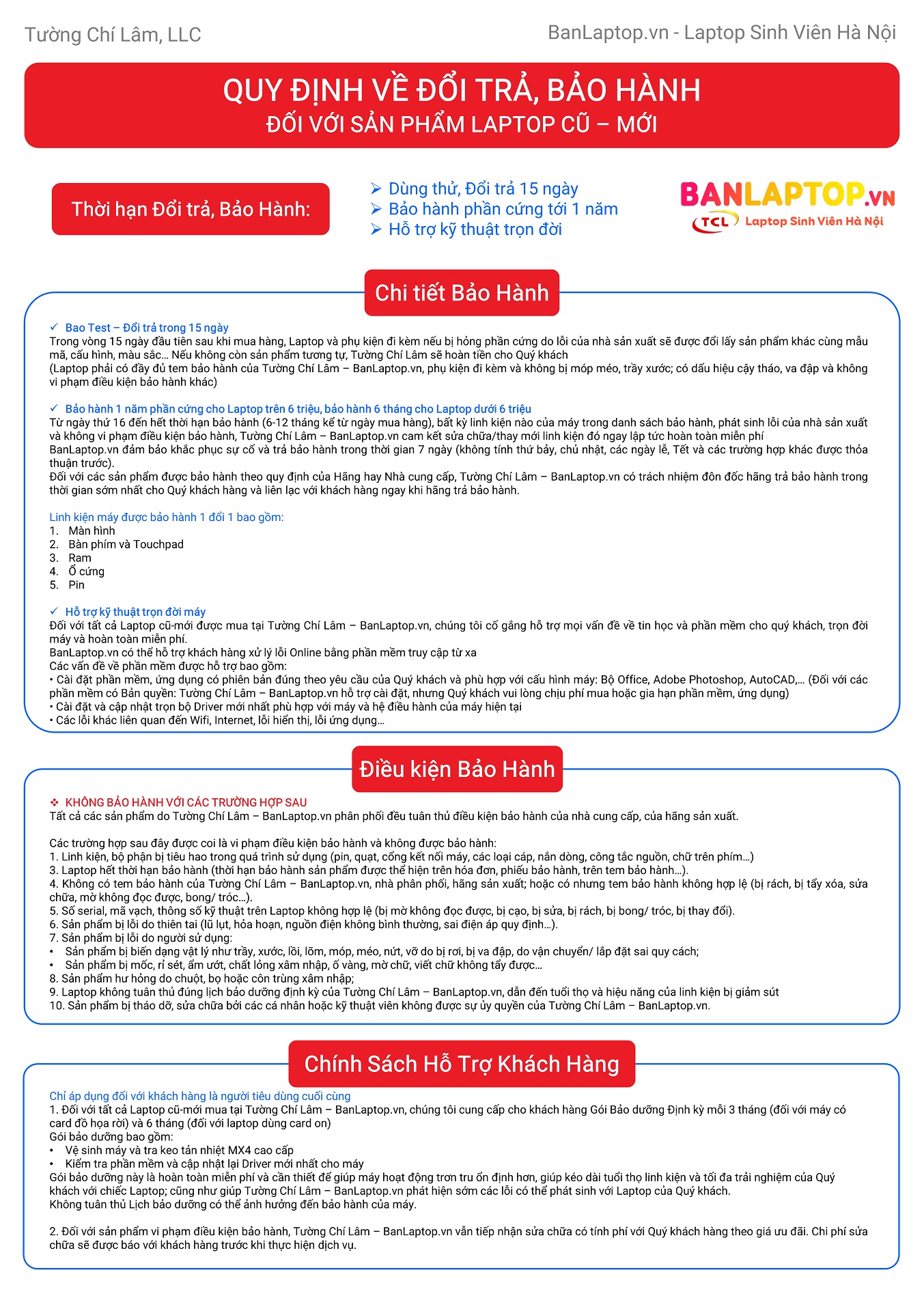 (Laptop phải có đầy đủ tem bảo hành của Tường Chí Lâm, phụ kiện đi kèm và không bị móp méo, trầy xước; có dấu hiệu cậy tháo, va đập và không vi phạm điều kiện bảo hành khác)