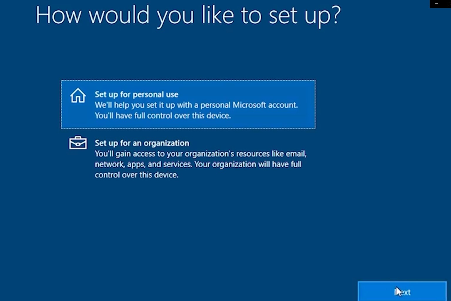 Bước 2: chọn Set up for personal use tức là người dùng cá nhân sử dụng và Next