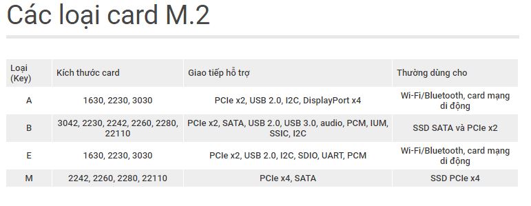 M.2 không chỉ được dùng cho SSD, nó còn được sử dụng các card mạng, Bluetooth gắn trong nữa. Vậy nên M.2 cũng có nhiều loại lắm, được gọi là Key. Mời anh xem bảng bên dưới cho dễ hình dung.