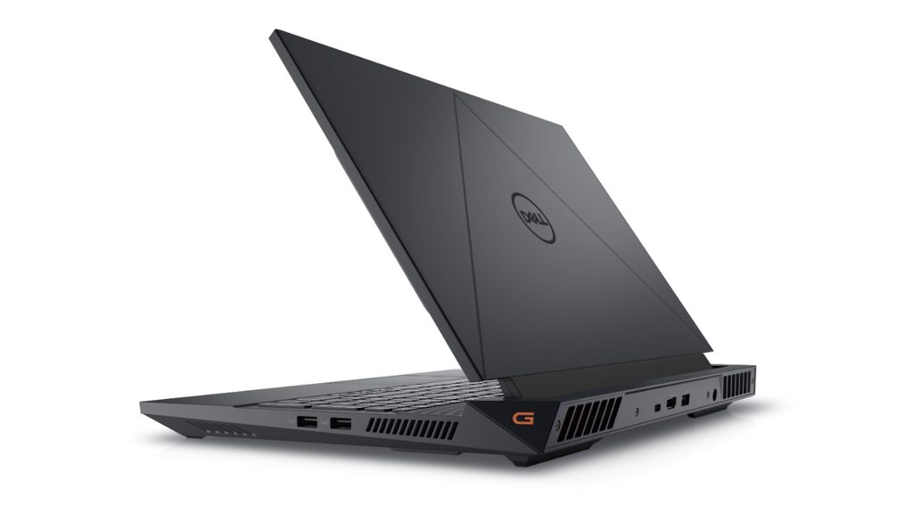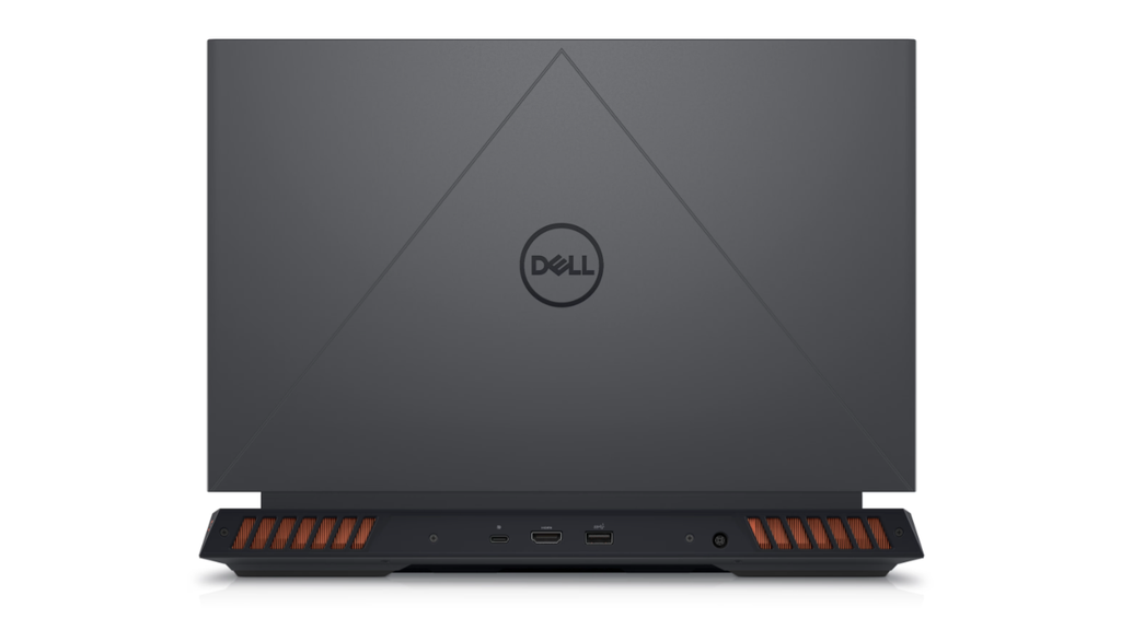 Mặt sau Dell Gaming G15 5530 in logo Dell đen bóng nổi bật ở giữa cùng hai đường rãnh tam giác.