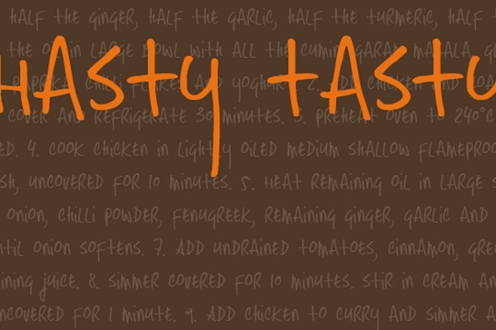 Phông chữ viết tay tốt cho logo, tiêu đề, tiêu đề, ghi chú nhưng không tốt cho văn bản thông thường. Hasty Tasty được tạo ra bởi David Kerkhoff là một phông chữ điển hình trong phong cách viết tay. Đúng như tên gọi của nó, Hasty Tasty trông giống như một công thức được viết vội, ghi nhanh vào một ghi chú. Phông chữ có đầy đủ các điểm nhấn để bạn có thể sử dụng nó trong một dự án đa ngôn ngữ.