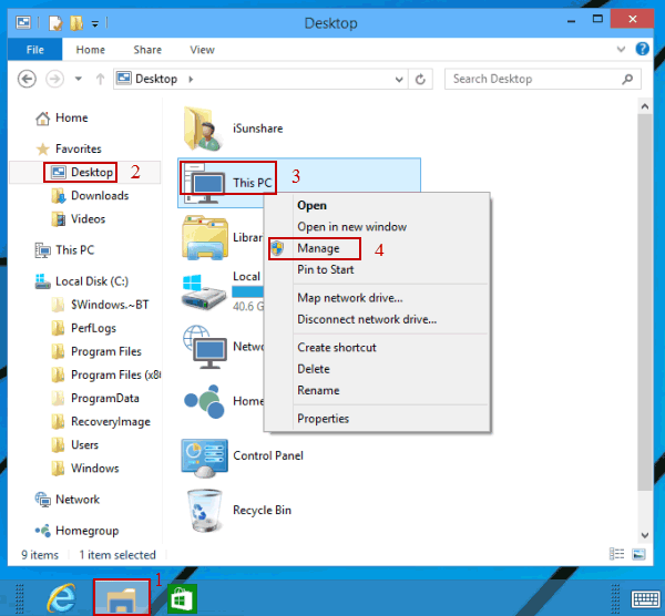 Bạn click vào biểu tượng tập tin ở thanh Taskbar. Ở góc bên trái bạn chọn mục Desktop. Click chuột phải vào This PC và chọn Manage.