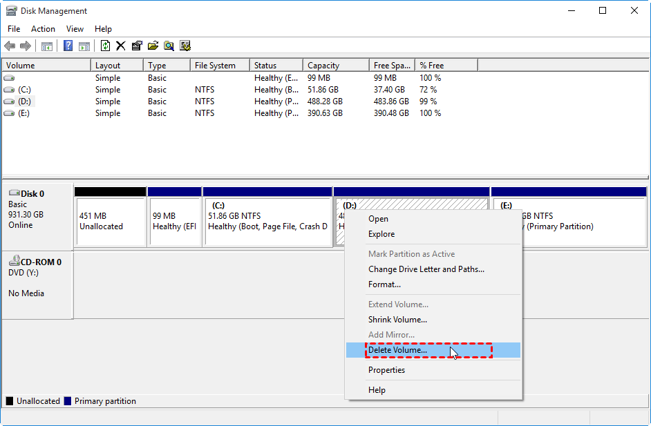 Bước 3: Bạn click chuột phải vào ổ đĩa mà bạn muốn gộp dung lượng vào và chọn Delete Volume
