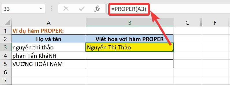 Lúc này, tại ô cần lấy kết quả (ví dụ như hình là ô B3), bạn nhập hàm =PROPER(A3) rồi nhấn Enter. Kết quả bạn có thể thấy tên "nguyễn thị thảo" đã được hàm chuyển thành "Nguyễn Thị Thảo".