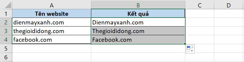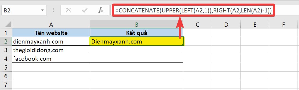 Đầu tiên, bạn sẽ cần dùng một hàm để tách chữ "d" đầu tiên trong chuỗi dienmayxanh.com ra, và viết hoa từ này, thành "D".