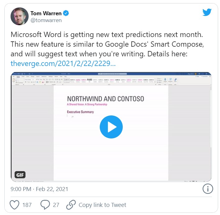 Theo một mục trong lộ trình sản phẩm của công ty, Word sẽ sớm phát triển được khả năng dự đoán văn bản. Tính năng này được thiết kế để dự đoán gần như chính xác những gì người dùng định viết tiếp theo. Nhờ vậy mà người dùng sẽ được hỗ trợ tối đa.