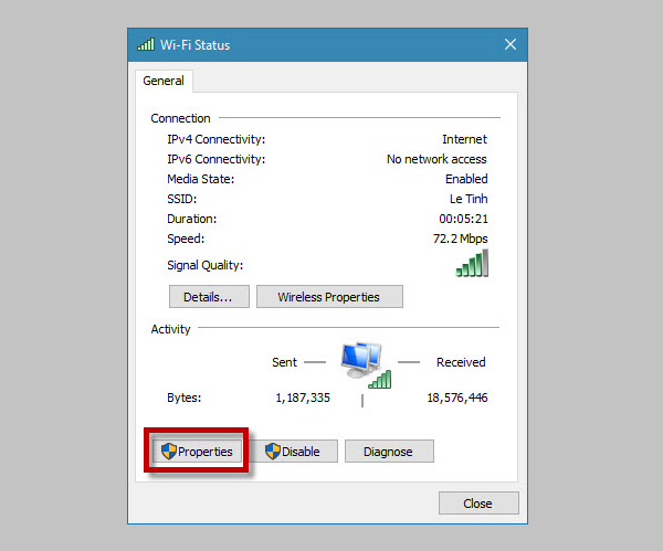 Bước 3: Tại cửa sổ Local Area Connection Status, chọn Properties