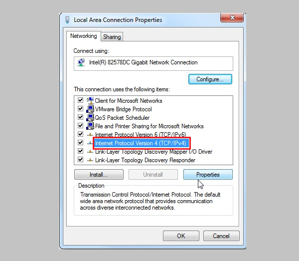 Bước 5: Click chọn Internet Protocol Version 4 (TCP/IPv4) sau đó chọn tiếp Properties.