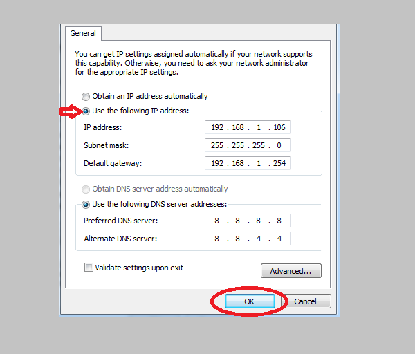 Bước 6: Chọn mục Use the following IP address và Use the following DNS server address rồi thiết lập các thông số như hình dưới đây