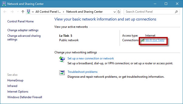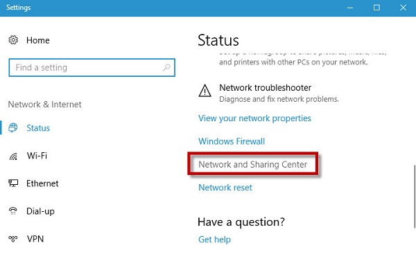 Bước 2: Chọn Status, sau đó chọn Network and Sharing Center