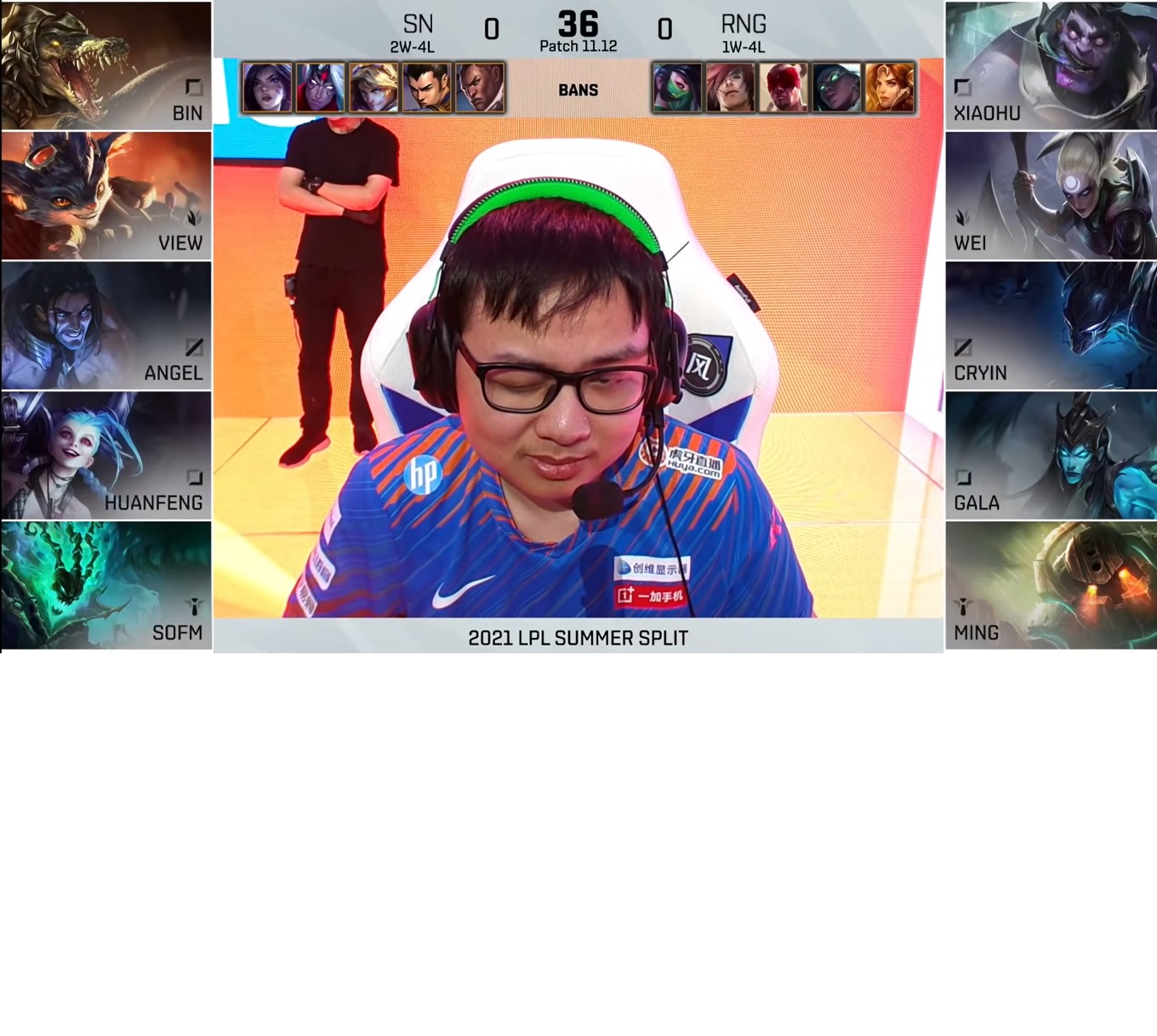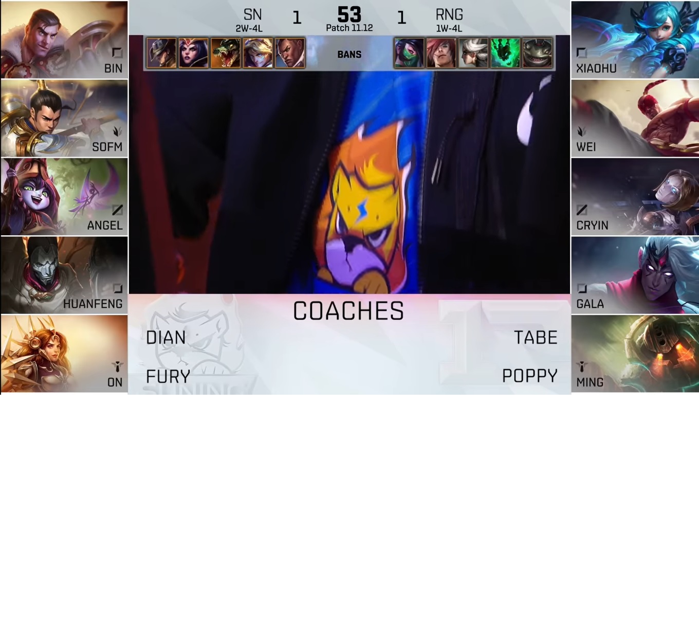 Trong phiên cấm chọn, SofM đã lấy cho mình Thresh để hỗ trợ cho con bài Jinx của Huanfeng. View lựa chọn Rumble để đi rừng. Angel cầm Sylas ở đường giữa. Trong khi đó, tuyển thủ đường trên số 1 của đội là Bin đã lấy cho mình Renekton.