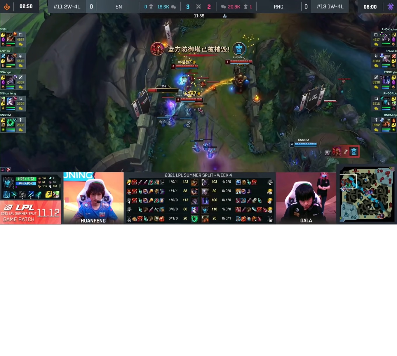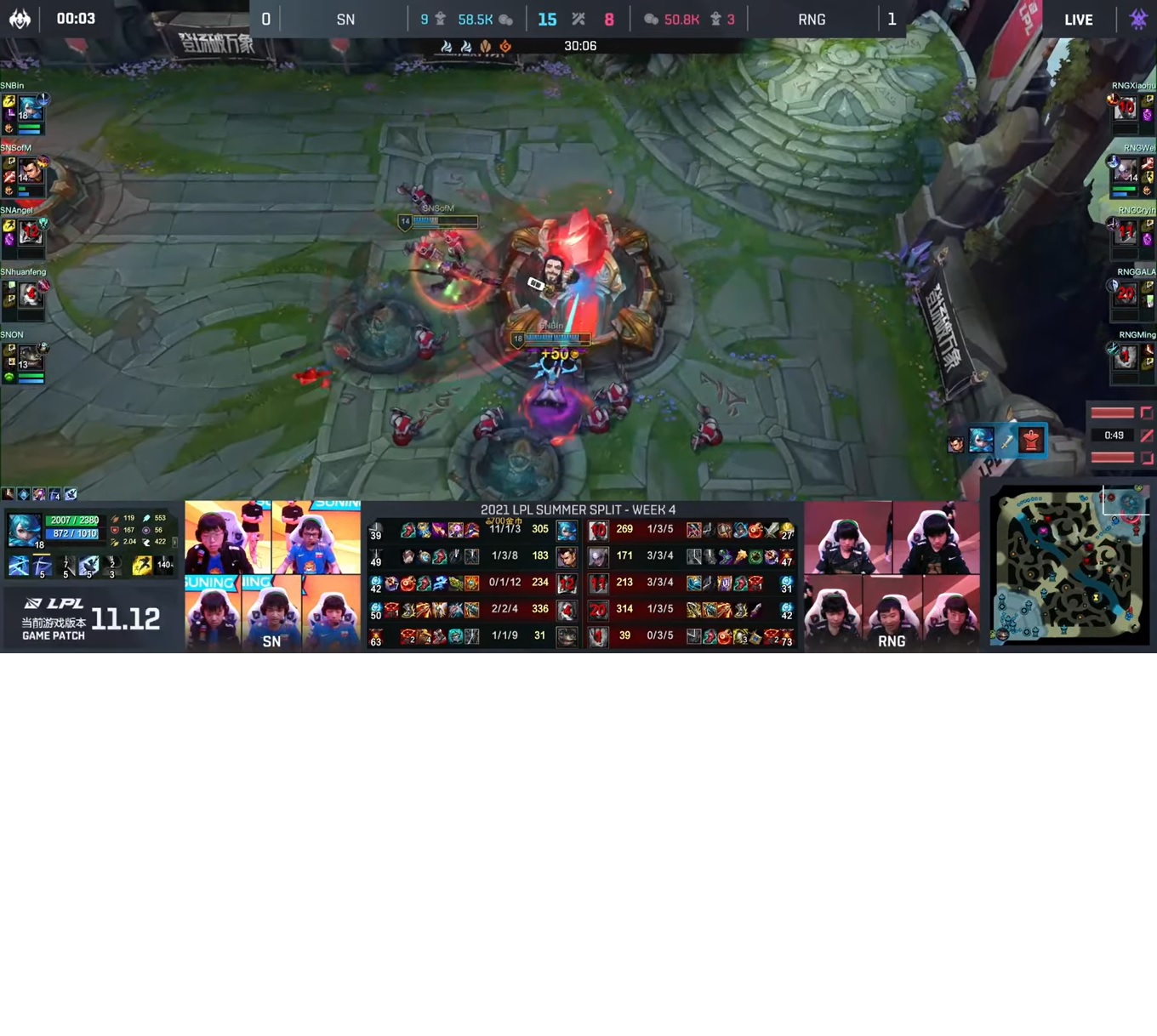 Thế nhưng, RNG cũng không vừa. Những pha ăn miếng trả miếng của cả hai đội liên tục xảy ra. Sau hơn 50 phút thi đấu, SN giành chiến thắng và thắng chung cuộc 2-1.