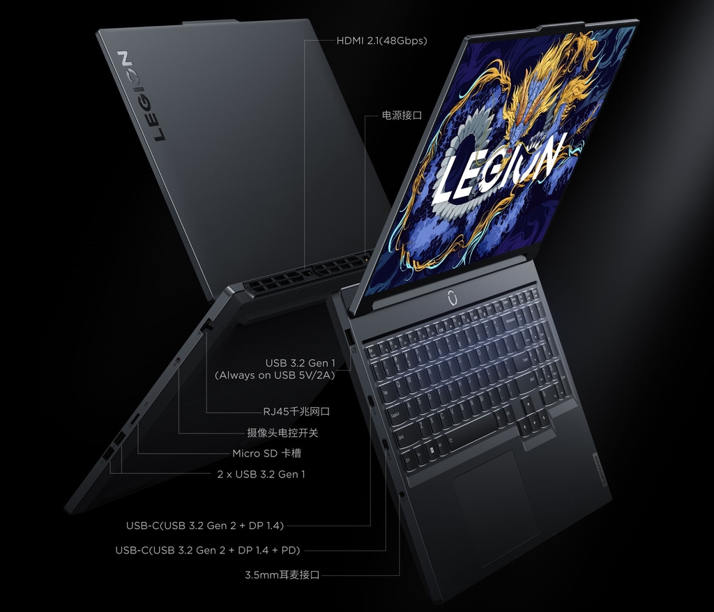 Lenovo Legion Y7000P IRX9 2024 trang bị đầy đủ các cổng kết nối hiện đại bao gồm 1 cổng USB-C 3.2 Gen 2(support DP 1.4), 1 cổng USB-C 3.2 (support DP 1.4 + Power Delivery 140W), 2 cổng USB-A 3.2 Gen 1, 1 cổng USB-A 3.2 Gen 1 (Always on USB 5V/2A), HDMI 2.1, jack tai nghe 3.5mm và cổng mạng LAN, giúp kết nối dễ dàng với các thiết bị ngoại vi khác nhau.