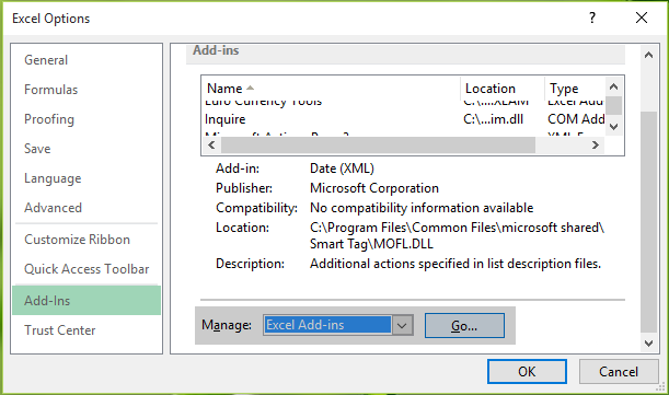 Bước 2: Trong cửa sổ Excel Options, lựa chọn Add-ins. Trong khung bên phải, bạn tìm tới Manage và click Go.