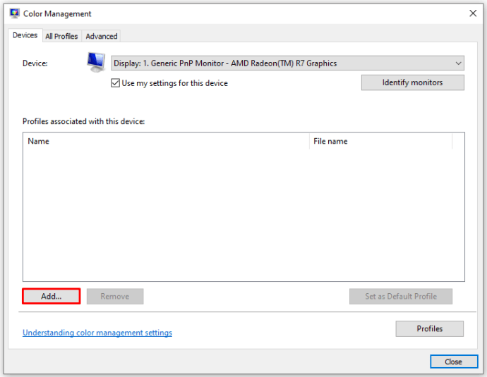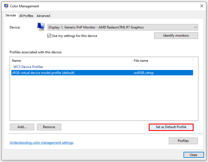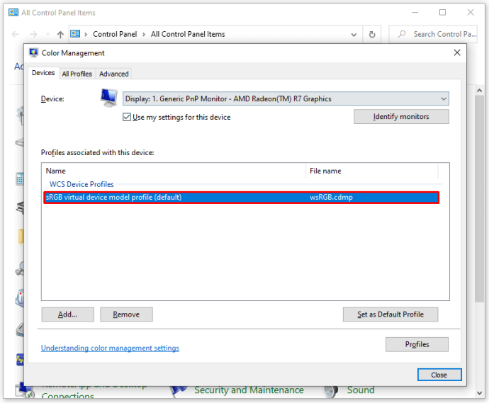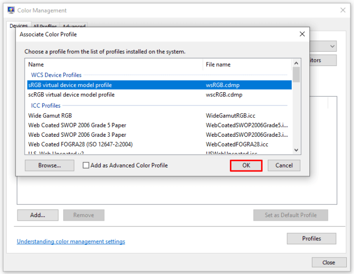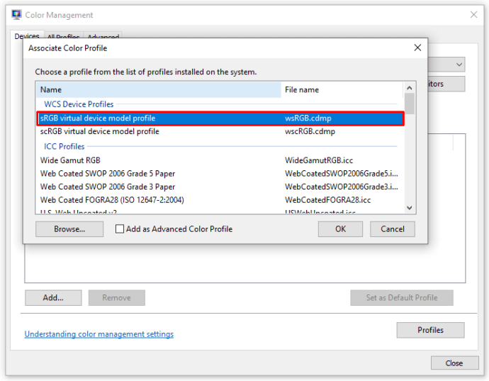 Bước 4: Một cửa sổ mới sẽ hiện ra, bạn chọn “sRGB Virtual Device Model Profile”