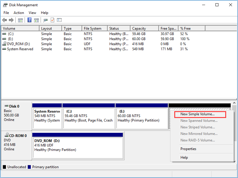 Bước 3: Khi cửa sổ mở ra, bạn click chuột phải vào ổ cứng bị Unallocated, sau đó chọn New Simple Volume