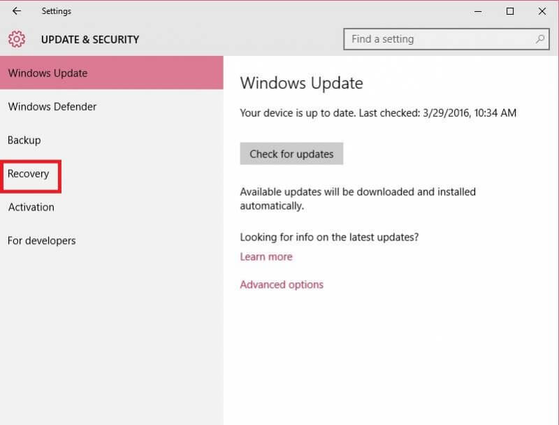 Bước 3: Chọn mục Recovery ở phía bên trái