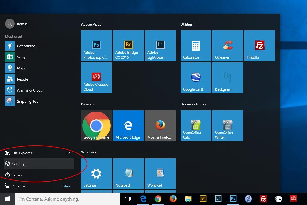 Bước 1: Click vào Start -> tìm và click chọn vào biểu tượng có hình bánh răng cưa (Settings)