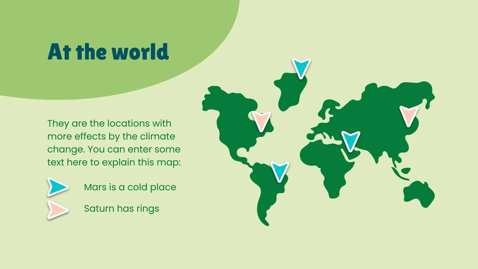 Bắt đầu bằng phần giới thiệu về biến đổi khí hậu là gì, nguyên nhân và hậu quả của nó. Nó cũng bao gồm bản đồ để làm nổi bật dữ liệu quốc gia, biểu đồ và đề xuất. Và nếu bạn muốn hoàn thiện bản trình bày của mình, chúng tôi khuyến khích bạn sử dụng các hình minh họa từ Storyset. Họ sẽ trông tuyệt vời!
