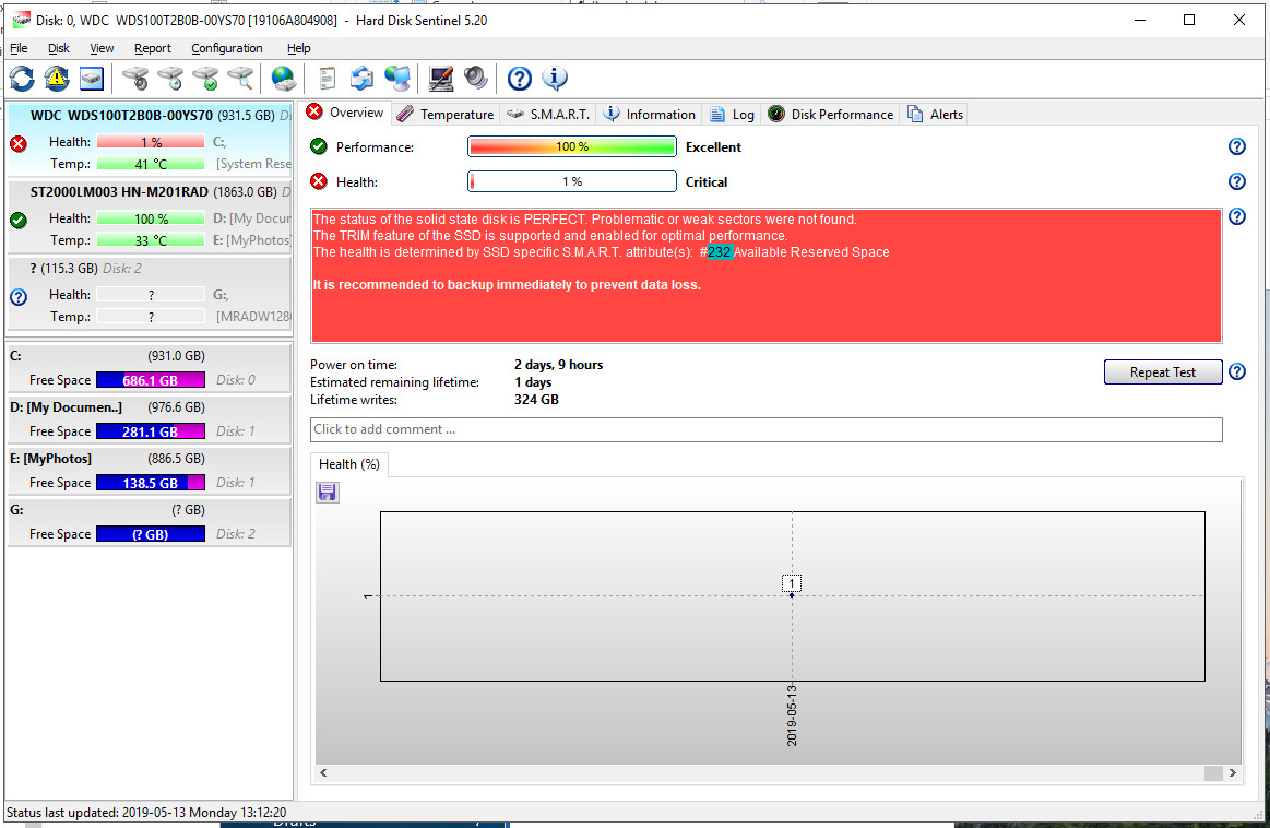 Trong cửa sổ chính của nó, Hard Disk Sentinel đưa ra mô tả ngay lập tức về (các) vấn đề được tìm thấy và thanh Health hiển thị mức độ sức khỏe tổng thể (0-100%) của đĩa cứng / SSD, dựa trên các vấn đề được phát hiện.