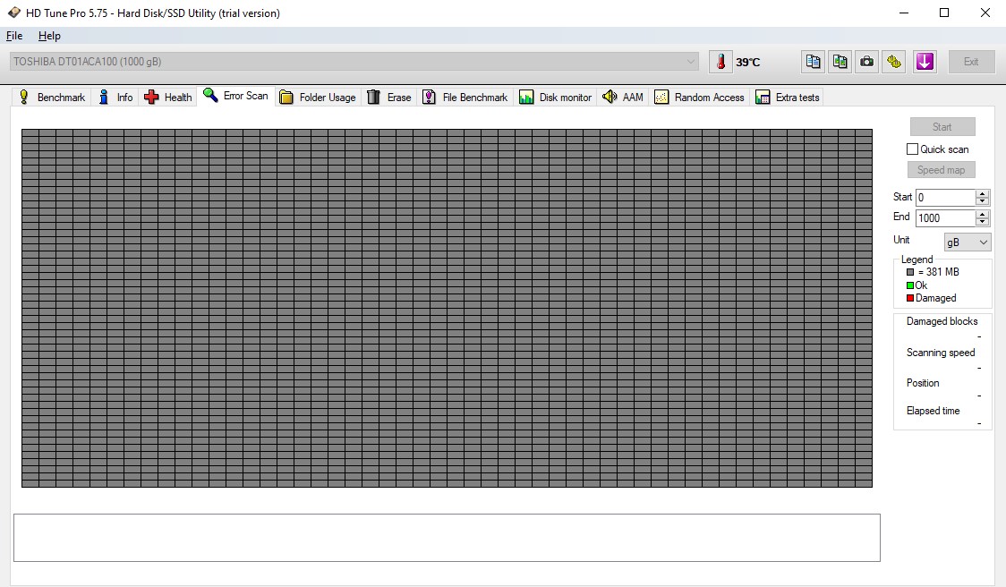Bằng cách nhấn nút Start, toàn bộ bề mặt của đĩa sẽ được quét để tìm ra các phần bị lỗi. Các khiếm khuyết sẽ hiển thị dưới dạng các khối màu đỏ.