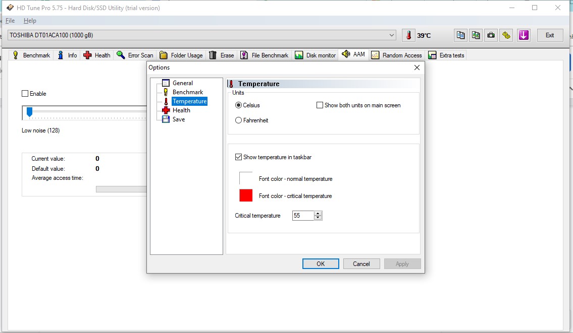 Trong màn hình tùy chọn, bạn có thể chọn đơn vị nhiệt độ (độ C hoặc độ F) và thông tin về nhiệt độ có được hiển thị trên thanh tác vụ hay không.