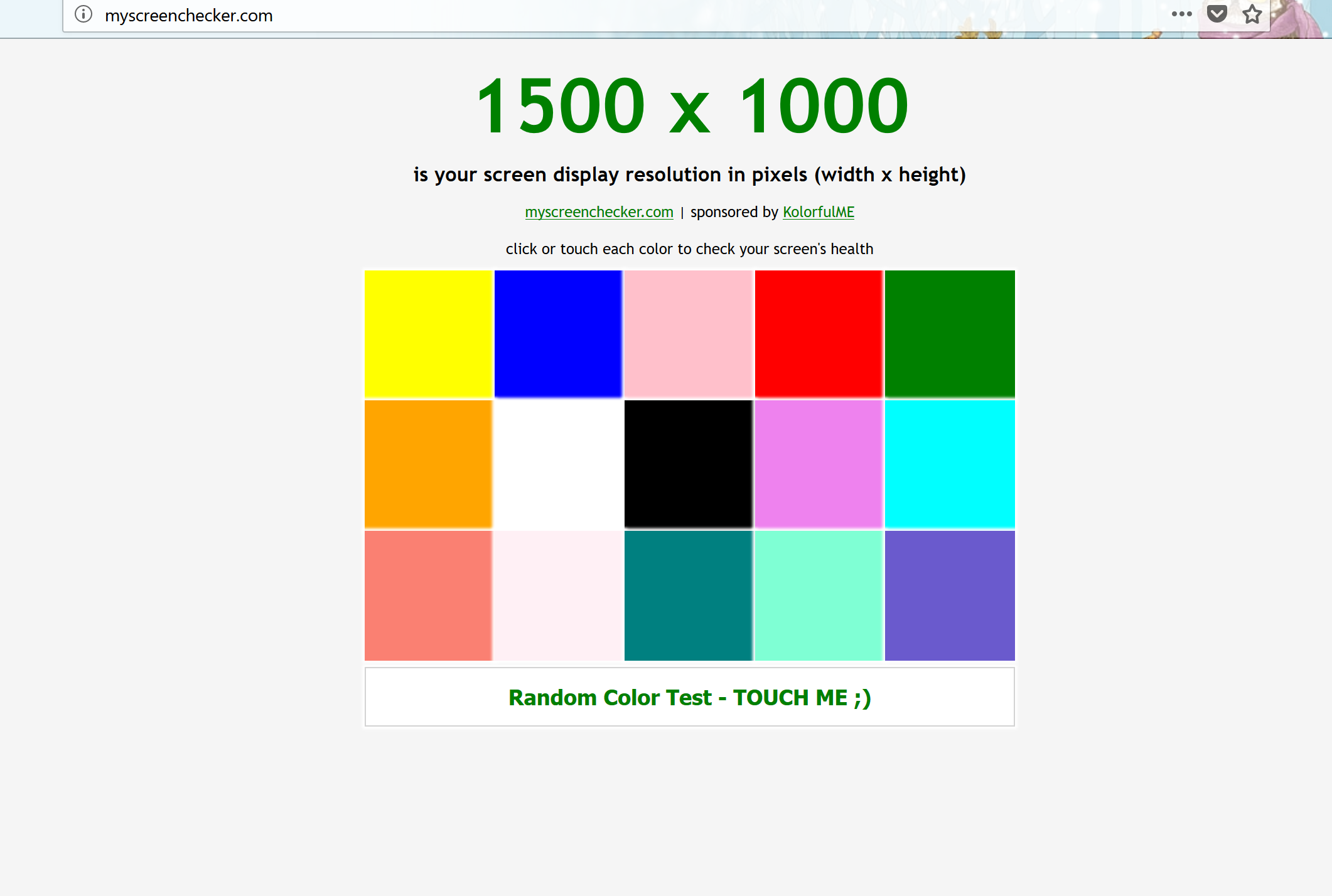 Ngay tại màn hình chính của trang web, bạn sẽ biết được độ phân giải hiển thị của màn hình laptop của mình. Ở phía dưới là 20 ô màu để bạn test màn hình.