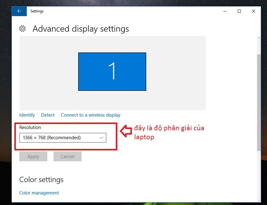 Lúc này, bảng thông số về độ phân giải màn hình laptop sẽ xuất hiện để bạn kiểm tra. Tất cả các máy laptop trên thị trường hiện này đều có độ phân giải tối thiểu là HD (1366 x 768 px) trở lên.