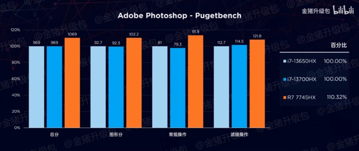 Cụ thể hơn, Ryzen 7 7745HX nhanh gần bằng CPU Intel trong các thử nghiệm như Cinebench hoặc Adobe Premiere Pro, trong khi nhanh hơn một chút trong Adobe Lightroom và Photoshop.
