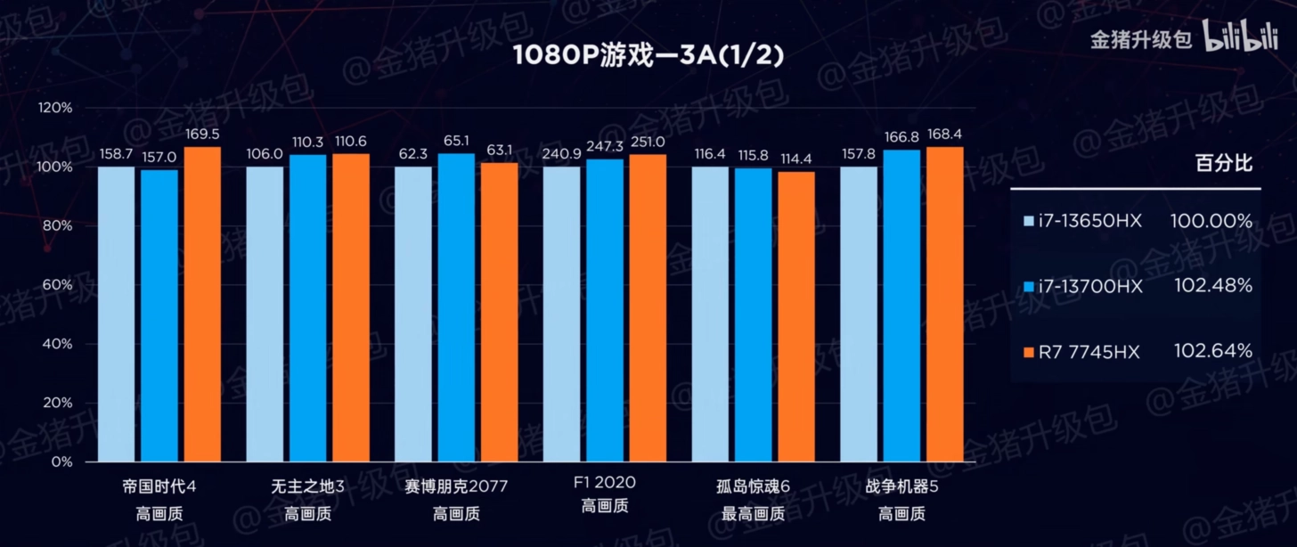 Khá thú vị, ngay cả hiệu năng chơi game của AMD Ryzen 7 7745HX cũng đáng ngạc nhiên hơn, khi tiếp tục vượt mặt cả Core i7-13700HX và Core i7-13650HX. Một số tựa game mới nhất đã được thử nghiệm và con chip laptop của AMD đã giành được vị trí dẫn đầu trong phần lớn các tựa game.