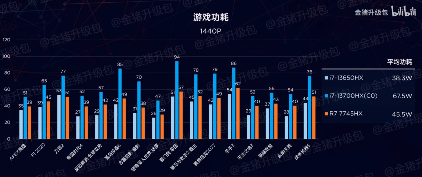Lý do đằng sau sự dẫn đầu này của AMD Ryzen 7 7745HX được thể hiện trong biểu đồ tiêu thụ điện năng. Các con chip Raptor Lake của Intel ngốn điện hơn đáng kể so với dòng chip Dragon Range của AMD, vô hình trung khiến phần công suất còn thừa còn lại của toàn bộ hệ thống không còn quá nhiều (tổng công suất được giữ giới hạn ở ngưỡng nhất định để đảm bảo laptop không bị quá nhiệt / không tốn pin).
