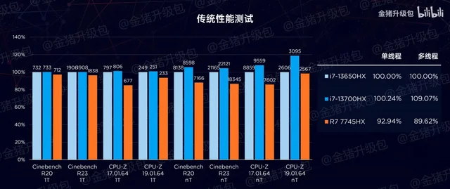 Hiệu năng xử lý đơn nhân (cột trái) và đa nhân (cột phải) của Ryzen 7 7745HX khi đối đầu với Core i7-13700HX và Core i7-13650HX.