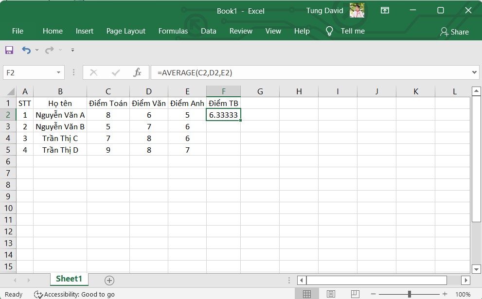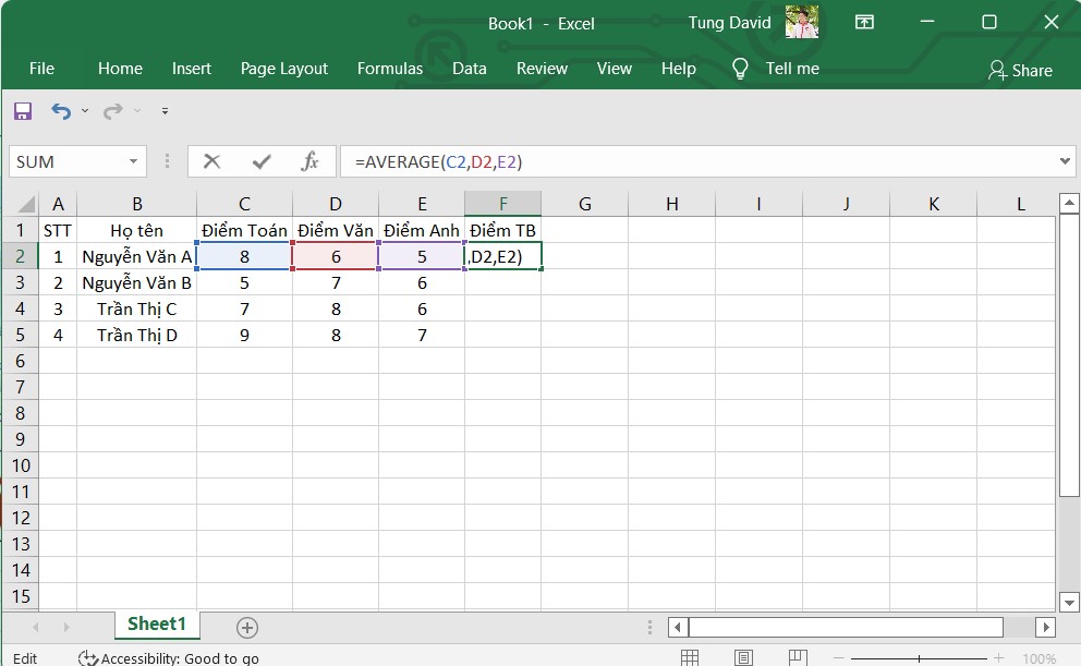 Tại ô điểm số trung bình đầu tiên cho học sinh đầu tiên, người dùng nhập công thức =AVERAGE(C2,D2,E2) rồi nhấn Enter.