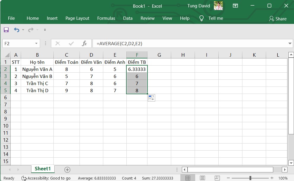 Để tính trung bình cộng của những ô tiếp theo, người dùng chỉ cần trỏ chuột vào ô kết quả đầu tiên và dùng chuột kéo xuống các ô phía dưới.