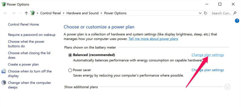 Một giao diện cửa sổ Power Options mới xuất hiện, bạn nhấn chọn vào Change plan settings.