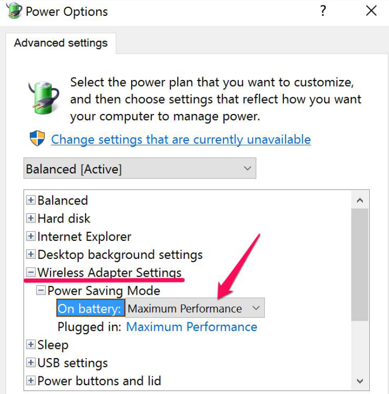Một cửa sổ mới xuất hiện ra, bạn tiến hành kéo xuống và tìm Wireless Adapter Settings.