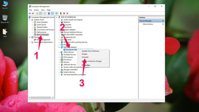 Trong giao diện quản lý Driver – Device Manager, bạn hãy tìm đến mục có dòng chữ Network adapters. Sau đó, nhấn vào mũi tên xuống và click chuột phải vào dòng Realtek PCIe PE…. hoặc Broadcom, Atheros… >> Nhấn Uninstall.
